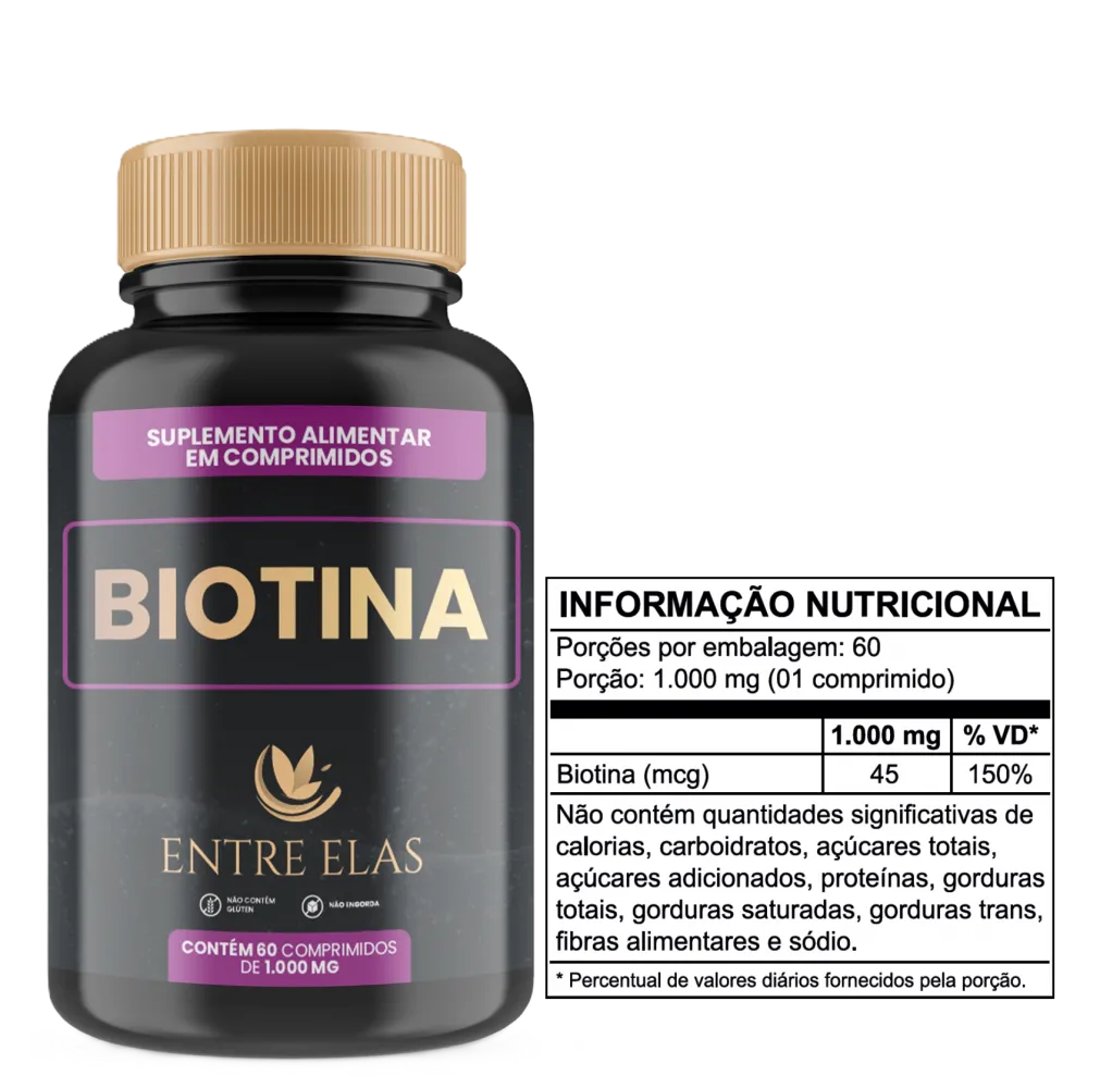 Biotina auxilia no metabolismo energético; No metabolismo de proteínas, carboidratos e gorduras; Contribui para a manutenção do cabelo e da pele; Auxilia na manutenção das mucosas; Alto teor de Biotina.