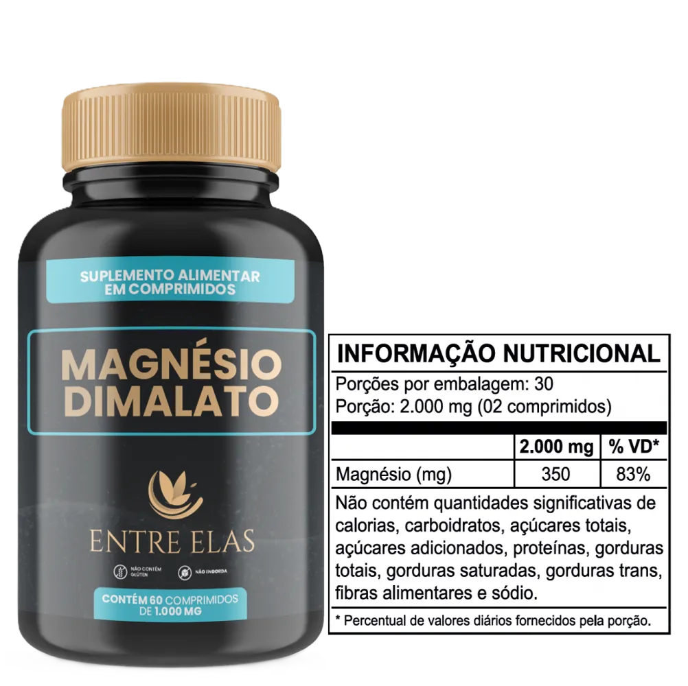 O Entre Elas Magnesio Dimalato é um suplemento alimentar com várias funções no organismo. Ele ajuda a fortalecer os ossos e músculos, pois melhora a absorção de cálcio, evitando assim casos de osteoporose. Também melhora o funcionamento cerebral, cardiovascular, ajuda a regular a pressão arterial e ainda evita casos de pedras nos rins. Foi desenvolvido para pessoas que apresentem deficiência desse mineral no organismo. Ainda age como um antidepressivo natural, retarda o envelhecimento e evita dores de cabeça. Disponível em embalagem com 60 cápsulas.