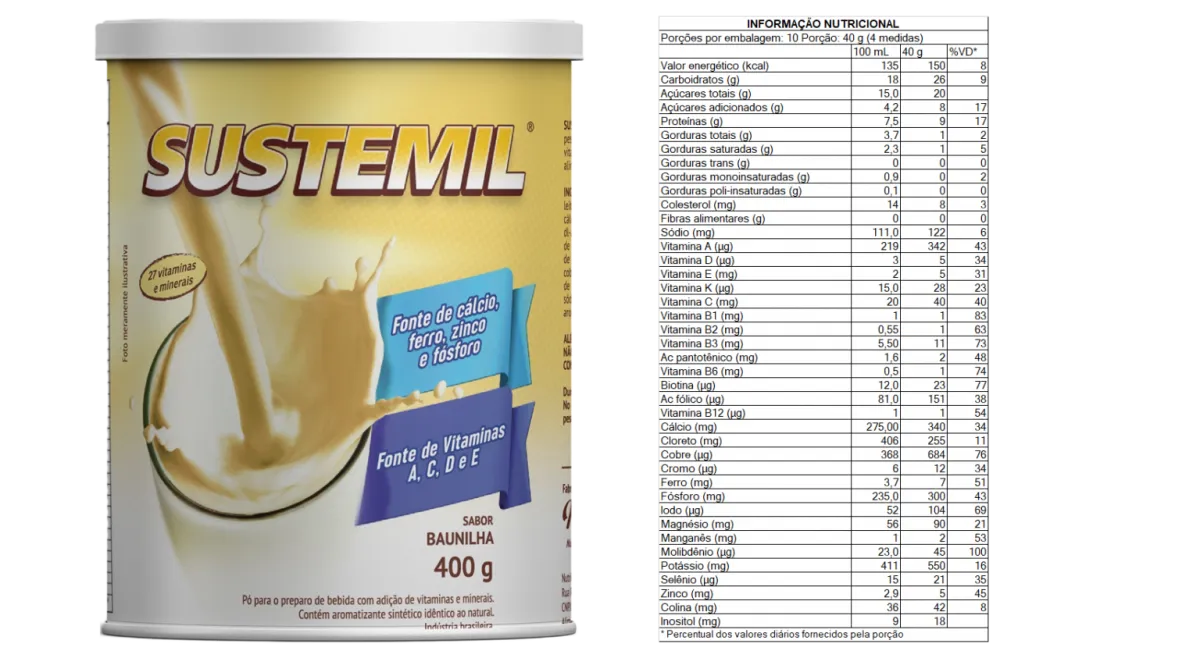 O complemento alimentar Sustemil em pó para preparo de bebidas com adição de vitaminas e minerais, contém aromatizante sintético idêntico ao natural e colorido artificialmente.